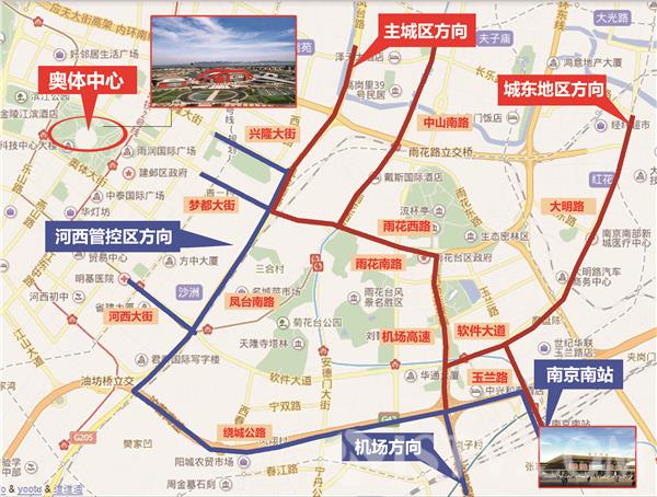 5、为方便闭幕式期间市民车辆出行,避开拥堵路段,南京交管部门就江北方向、城北方向、城东方向、城南方向及机场、南京南站方向等五大来车方向规划推荐了17条南京城区的出行线路供市民参考。