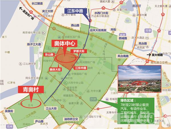 3、8月28日7时至23时,东起赛虹桥立交、凤台南路、油坊桥立交,南起江山大街(油坊桥立交至庐山路段)、庐山路(江山大街至吴侯街段)、吴侯街(庐山路至扬子江大道段),西起扬子江大道(吴侯街至应天大街段),北起应天大街(扬子江大道至燕山路段)、燕山路(应天大街至积贤街段)、积贤街、所街、西城路(所街至应天大街段)、应天大街(西城路至赛虹桥广场段)所合围区域(以上路段均不含本道路),以及扬子江大道(下关大桥至应天大街段)、江东中路各隧道、长江隧道、夹江大桥、浦口大道、应天大街高架全线(见图2),除青奥服务保障车辆外禁止载货汽车、专项作业车、工程机械车、危化品运输车通行(上述车辆原来持有的通行证在此期间暂停使用),已在上述交通管控区内的,严禁上路行驶。