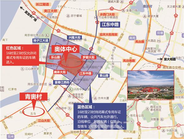 2、8月28日16时至23时,东起黄山路(松花江东街至富春江东街段),南起富春江东街(黄山路至江东中路段)、富春江西街,西起扬子江大道(富春江西街至兴隆大街段),北起兴隆大街(扬子江大道至黄山路段)所合围区域(以上路段均不含本道路),以及江东中路(水西门大街至梦都大街段、奥体大街至江山大街段)、江东南路(江山大街至平良大街段),即图1中蓝色区域,除持有闭幕式专用车证的车辆、公共汽车及执行紧急任务的警车、消防车、救护车、工程救险车外,禁止其他车辆驶入。上述区域内的道路沿线单位、居民车辆(只限小型客车),可凭有效证件就近出入。同时,允许社会车辆在江东中路(集庆门大街至兴隆大街段、富春江西街至江山大街段)、江东南路(江山大街至平良大街段)的沿线交叉路口东西向通行。