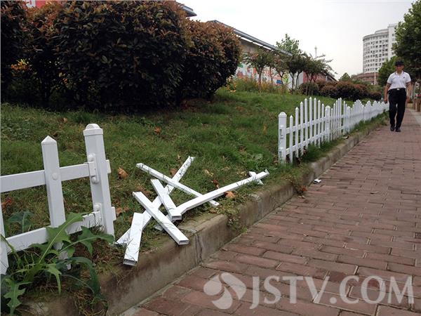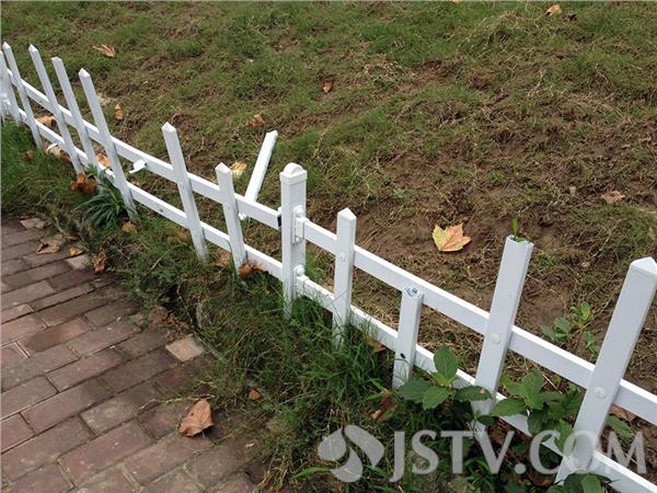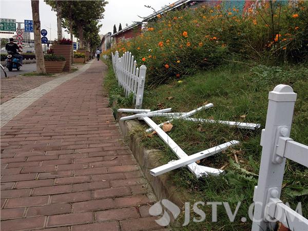 青奥会期间,南京绿化部门为了美化环境,在新模范马路北侧的拆迁工地广告牌下,种了许多美丽的桑格花,为了防止人、动物进入花池内破坏鲜花,还在花池外安装了白色的塑料栅栏,不过青奥会刚过,白色栅栏已经东倒西歪,支离破碎。