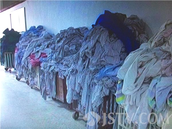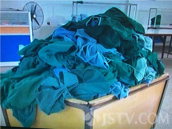 走进厂区,车间内堆放着床单被套、手术服、病员衣物等,通过字迹可以看出,它们来自江宁中医院、同仁医院、南医大二附院、南京第一医院、中大医院等多家大医院,工人们介绍,他们工厂不接外单,专门洗涤南京各大医院的被服,由于工厂工序简单、设施不完善,每天洗涤产生的大量污水没有经过达标处理,就通过这条长沟对外排出,工厂设在排污口的仪器显示,这些污水的PH值超过10,呈碱性。