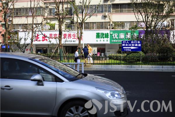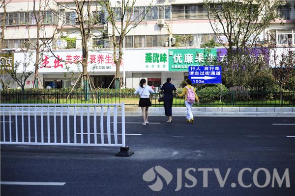 笔者今天下午,在定淮门隧道出口看到,从江东北路往模范西路方向隧道口行驶出来的汽车川流不息,但是不少行人仍然从车流中穿行。笔者在隧道出口醒目的看到,一块蓝底白字的行人过街指引牌,安装在路中的绿化带上,然而就在这牌子下面,却是被人为撕开绿化带围栏踩出一条小路,笔者看到不少想横穿定淮门大街的行人,为少走路,爬上半米高的绿化带,然后再跳下,穿过两车道的隧道口,可以说是危险重重,让人不寒而栗。