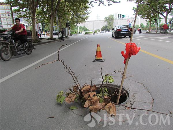 现场看到,窨井位于南京江宁路十字路口,有人捡来了干枯的树枝、竹杆插在窨井内,上方还绑着红色塑料袋,在窨井北侧还放着一锥筒作为警示。走进窨井附近,一股恶臭气扑面而来,污染了环境。窨井深度近3米,一旦跌进去,后果不堪设想。据了解,这个窨井就这几天不知去向。一些好心人为了防止早晚上学的孩子和老人掉进井中,特意找来枯树枝竹杆系着塑料袋插进去,作为遮挡和提醒。居民们心有余悸,惟恐躲闪不及,期盼着相关部门能及时解决这块窨井盖,还市民一个安全通畅的道路。徐福庚 22日摄