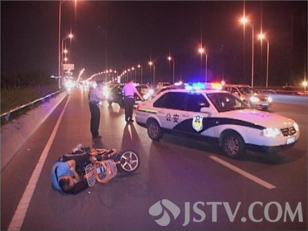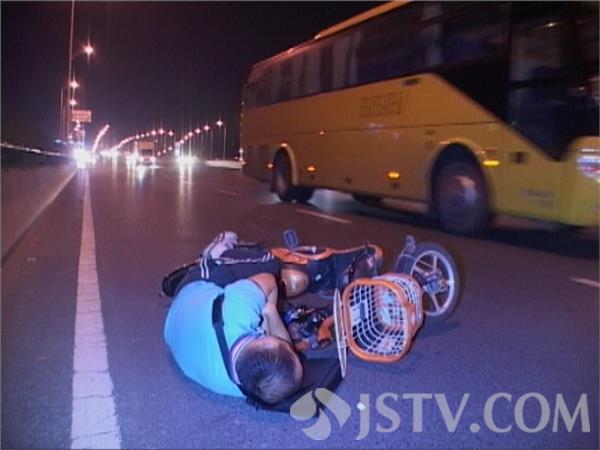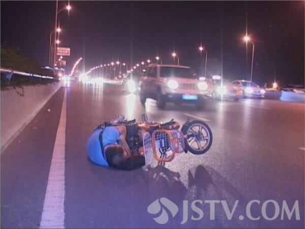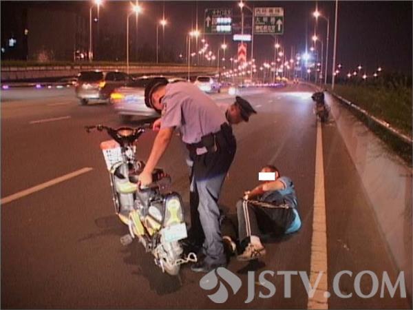 今晚九点半,的哥洪师傅开车由北向南路过龙蟠南路高架上时突然发现路面快车道上横躺着一名中年男子和一辆电动车,紧急刹车绕过男子及电动车,惊出了一身冷汗随即报警。很快秦淮区特巡警赶到现场,由于高架上车速极快,频频险象环生。一名民警不顾自身安危站在男子前方,一边打手势,一边将警车停在男子前方,上前询问发现男子可能喝多了酒,醉倒在高架上不省人事,紧接赶到的交警及120将男子喊醒后,带上警车送往三大队醒酒。很多路过的车主表示电动车本身就不允许上高架,像这样醉倒在高架上更是匪夷所思的行为,幸亏发现及时才未酿大祸。