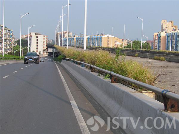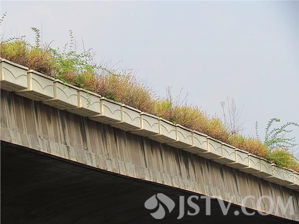 昨日笔者来到应天高架,在通往大明路匝道口附近,发现此桥有一段被围挡栏着,一幅巨大的广告遮挡桥面,桥面上竟然有一辆电动车,五马分尸;两侧19根路灯杆配电合被打开,内脏被偷;两侧悬挂的数百盆塑料花盆里,长满狗尾草,最高的约50厘米。看到数百盆荒草丛生,路过的几位驾车人,纷纷说:应天高架是南京唯一的“杂草桥”。一直无人问,如今越长越高。 徐福庚 摄