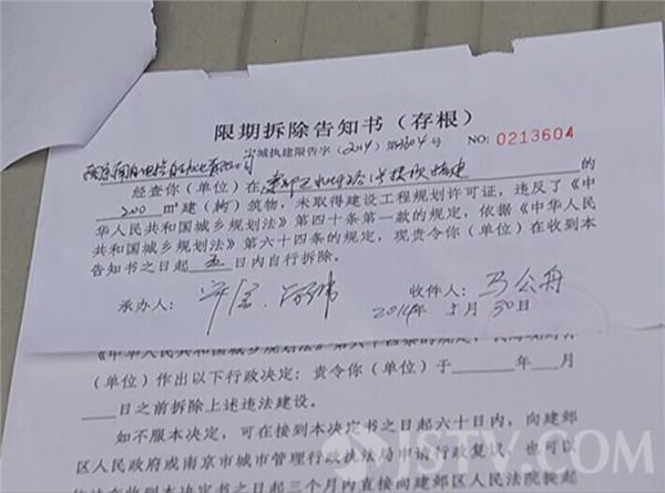 南京莫愁湖街道表示,限期拆除决定书已经发给当事人,他接到这个通知书决定书以后,有个六十日内或者三个月内可以提起行政诉讼,三个月以后发强制拆除通知书给他,大概前前后后还需要四到五个月时间。