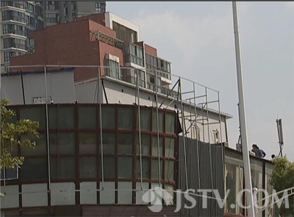 在南京水西门大街和北纬路的十字路口,车辆川流不息,过往的市民也非常的多,而我们看到一个比较不和谐的现象,在马路对面商户的楼顶上有几间活动板房,与路口的环境十分格格不入。