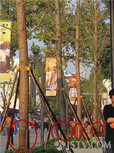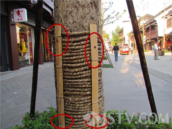 在南京夫子庙,果然看到花坛中20棵还用四根木架支着的银杏树,这些树十分高大,树干直径大约二十公分左右。每棵在离地面一米左右的树干上缠绕着草绳,并在草绳外排列钉着几根1米左右木条、竹片,裸露在外的部分已经生了锈。游客指着树上的铁钉说:“这20棵树上钉这么多,我数了数每棵树15-20根铁钉!”如此残忍?