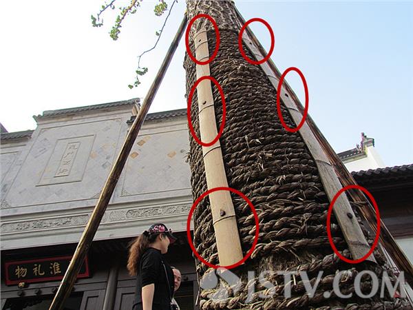 据了解,这些银杏树是2014年夫子庙改造新栽的,为了成活率缠绕草绳,并在草绳外钉了板条、竹片。“被钉上铁钉的树均为珍贵的银杏树,树也有生命,钉了那么多钉子,让它怎么活?”游客担忧地说。