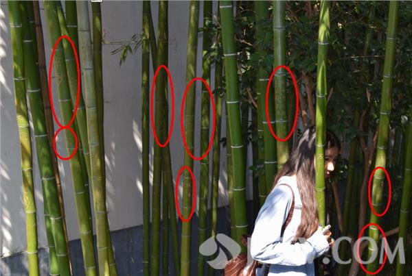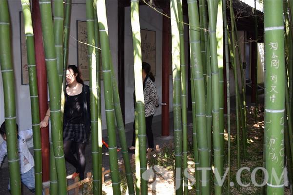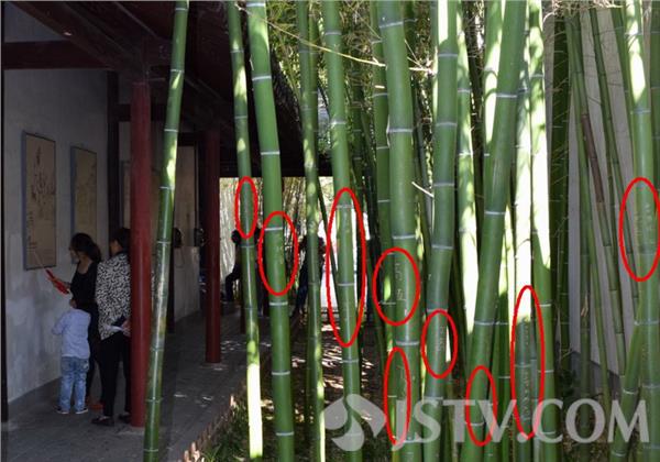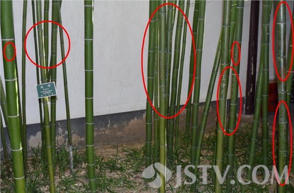 就在大片斑痕累累的竹林区,仍有不少游客驻足拍照。一位姑娘站到竹林跟前拍照时,意外发现竹子上竟然有众多刻画,不免惊讶苦笑一阵后,才选定一处地点拍照。据悉,该片竹林植根总统府核心地段,属庭院修竹观赏区,以淡竹和刚竹为主。由于游客众多,这里竹子经常遭人刻画,大多为常见的“**到此一游”之类。但象今天这样竹竿上留有众多新鲜字迹的情况还是少见。初步怀疑,应是国庆长假期间游客暴增后留下的“成果”。有游客表示,大片竹林遭人连片刻画,伤痕累累,实在不雅,有损景区形象。