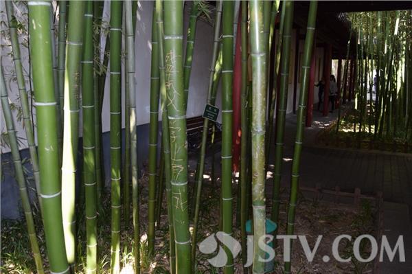 昨天笔者携友人去总统府游玩时,发现在景区内东园入口,竟有大片的竹林遭到了游人刻画,刻画数量之多,“个人签名”足不下数百条,其中很多为新近刻画,字迹还十分新鲜。游客经过,不免感觉扫兴。