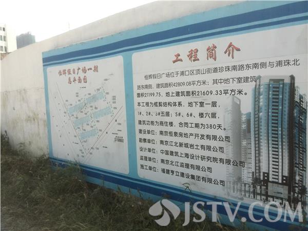 今天上午,记者跟随南京市浦口区扬尘办走访了几家施工工地,记者驾车在浦口的浦珠中路的高架上,发现一工地正在施工,是扬尘四起 ,随即赶到了此工地,此工地为恒辉假日广场工地,现场发现这个工地是挂了扬尘污染防治评级黄牌单位,说明这家工地已经检查过,扬尘污染存在问题,但还是未解决。