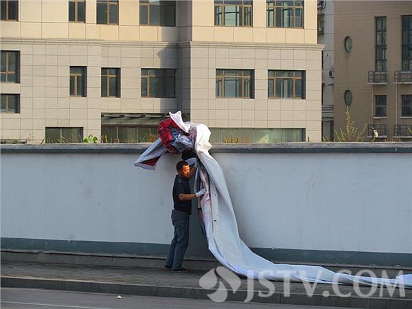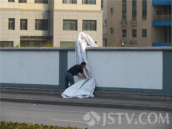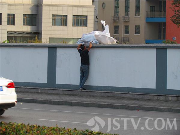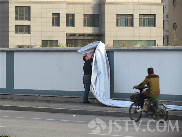 在南京秦淮区龙蟠中路通济门桥旁现场,只见工地里杂草丛生,围墙有一人多高,可望得见的围墙内1人多高枯草,约一个足球场大,围墙边堆积着不少垃圾等,虽然围墙很漂亮,但是围墙里面一片狼藉。23日下午,亲眼目睹一位工人,将龙蟠中路一面广告布换下来,直接扔进围墙内,成了垃圾池。