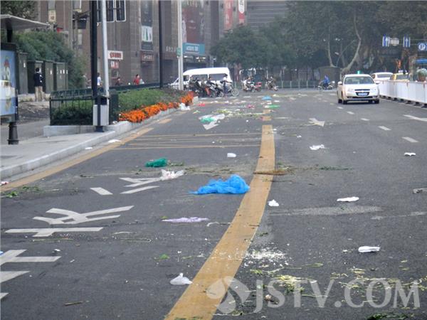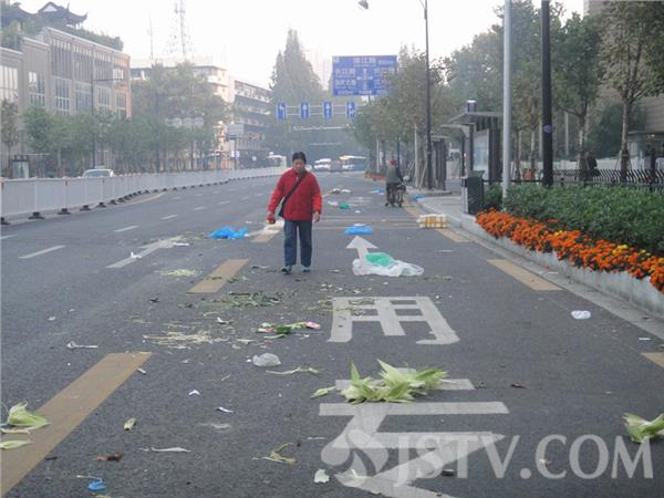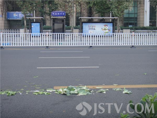 负责这里清扫的玄武区环卫工人师傅说:“太平北路在青奥后前出新后,便成了附近菜贩们凌晨“兑菜”的市场,半个月前经媒体曝光后,有关部门曾下力气给予整顿取缔。然而,好景不长,没过多少天这里又恢复了原样,令我们很头疼。每天早晨十多个环卫工要用一个多小时在这清理脏乱现场,清运的烂菜叶和其它垃圾有十多袋。