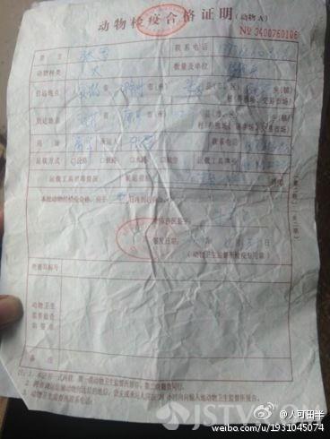 在这份动物检疫合格证明上显示,这位摊主在今年七月份和10月份,分别从安徽来安进了800头和200头狗。对此,动物检疫执法人员表示,这个检疫证明只是针对整只狗,而销售的狗肉确实没有经过检疫。
