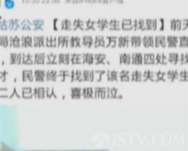 10月30日晚9:40,与家人失联88个小时的苏州初一女生姜某,终于在南通市内被找到,与父母团聚。