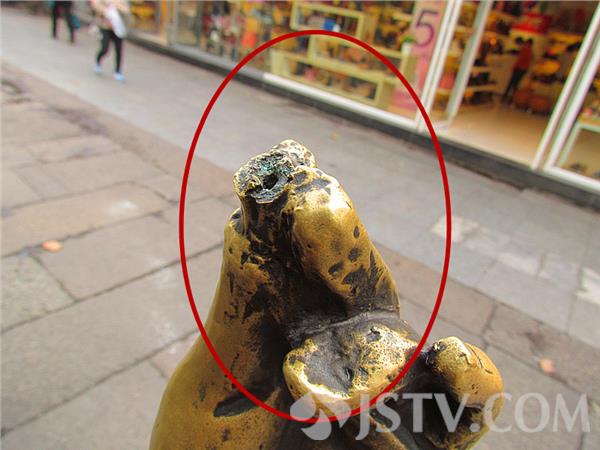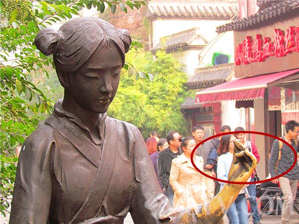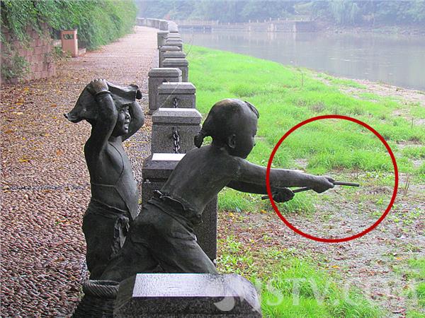 对于像广场上的公共铜雕,是供人们欣赏的,让人们在工作之余,可以得到精神的放松。然而, 笔者随后对南京街头、景区进行采访,发现南京夫子庙广场北门附近,《卖花姑娘》雕塑建成后,成为南京夫子庙一大亮点,吸引了众多游客。如今,很多外地游客到夫子庙后,都要到“卖花姑娘”雕塑前参观、留影。中华门秦淮河畔《河边钓鱼男孩子》鱼杆被锯掉,只剩下一节,《小朋友手持竹杆粘知了》竹杆整个锯断。这些铜雕却频遭毒手,被人为损毁比较严重,铜雕出现了残缺,看着很不舒服。