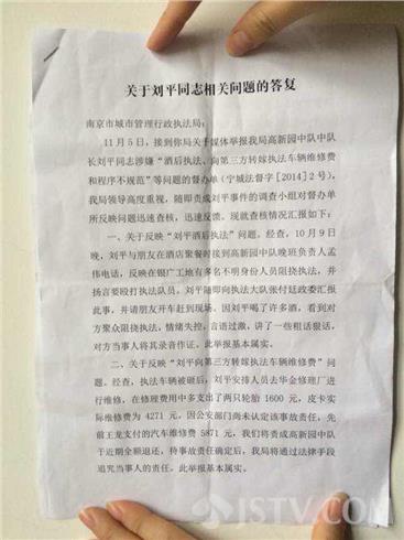 今天上午,江宁区城管局向记者出示了一份红头文件和一份处理决定:经向刘平本人核实,酒后执行公务基本属实。按照南京市城管局“六条禁令”的相关规定,给予刘平免职,并下岗六个月的问责处理。