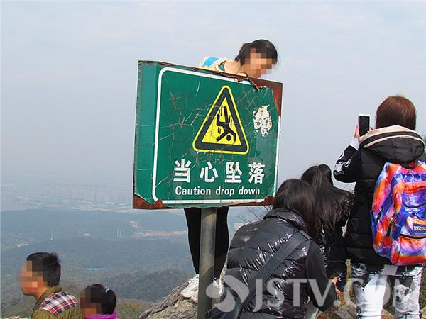 在现场看到,南京紫金山顶峰边沿立着几块醒目的“当心坠落”的告示牌。然而,发现有不少游客站在山顶边沿远眺南京,有坐的、也有摆POSE的,那一幕幕让人胆惊受怕的感觉。一位外地游客说:紫金山是南京的绿肺,慕名而来的游客和市民众多,看到如此游客,不注意安全,实在让人捏把汗。看到“这些告示牌形同虚设,立不立都一样。”看着这么多游客,总觉得心慌,要是哪天万一掉下去,可不是闹着玩的。”