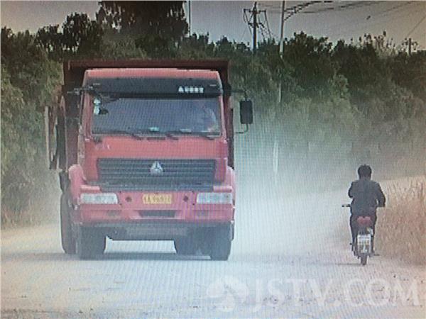 这个画面可不是什么沙尘暴现场,而是今天下午雨花台区一家工地附近的道路。这条路已经积满了灰尘,上面也压出了多条车轮印。记者看到,多辆工程车从这里来来往往,却没有一辆进行密闭运输,骑电动车通行的市民只能一手捂脸一手骑车。
