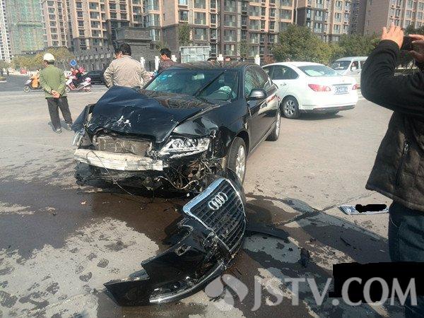 记者赶到现场时,受伤的驾乘人员已被接送到医院救治,一辆由东向西的奥迪汽车整个车头部分已经是面目全非,被撞坏的零部件散落一地,前挡风玻璃破裂,安全气囊打开,牌照脱落,车子里的汽油淌了一地。远处一辆由北向南的悦达起亚汽车,由于巨大的冲击力,已经被撞飞到旁边工地的围墙处,右侧的前门和车轮部分受损严重,现场围观群众告诉记者,悦达起亚的驾驶员受了一点伤,是被人抬走的。