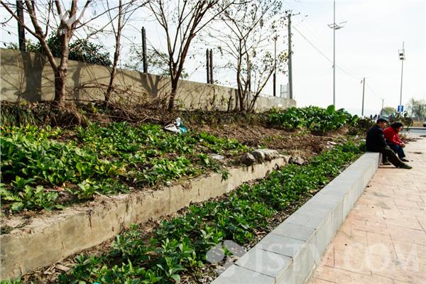 明发滨江广场是小区的核心部分,不少市民前购物、买菜。却在这入口处,原本用来美化环境种花的大理石花坛,8个底部朝天,丑陋无比。在明发滨江的三期靠近江边的一小区内,不少绿化被铲除,种上了蚕豆和各种蔬菜。这些菜郁郁葱葱长势“喜人”,有小腿那么高,说明这菜长了不是一天二天了。