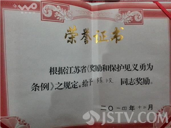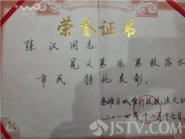今天下午,南京市城管执法总队和秦淮区城管执法大队召开表彰大会,对陈汉见义勇为的行为予以表彰,奖励陈汉综合绩效考评100分,而在稍早前,南京市秦淮区见义勇为基金会也对陈汉予以了表彰,并奖励人民币2000元。面对荣誉,陈汉谦虚地表示,功劳其实是大家的。