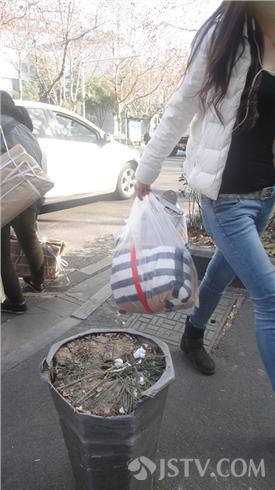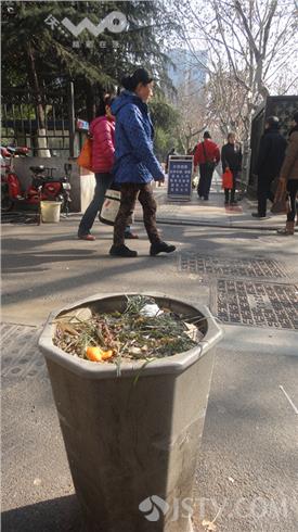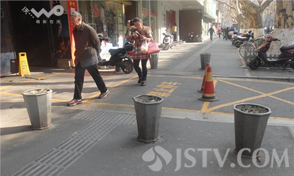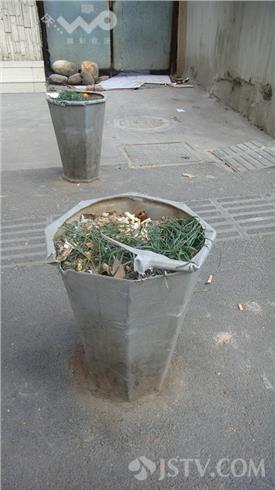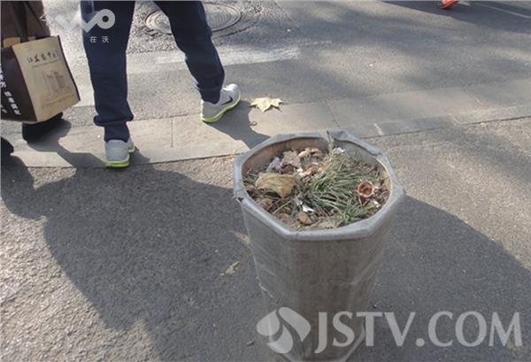 附近做生意的刘师傅说,类似情况中山北路上比比皆是。为确切地了解周围情况,笔者经指点从云南路旁的江苏议事园步行街起,经军人俱乐部——金山大厦——山西路布料城,到达龙吟广场,然后过马路,转向街对面的华江饭店,经山西路邮局——青少年宫——交通银行——中央商场,返回到云南路口,在四公里多的人行道上,细数了一下大约有类似的花盆86个。绝大多数花盆均不同程度地存在各种垃圾,有的上面还有一次性纸杯、饮料瓶等。