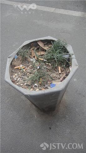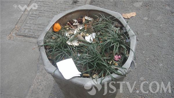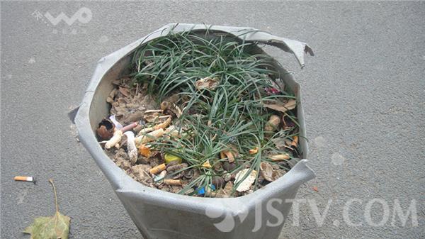 今天早上笔者途经中山北路山西路百货商店,发现商场附近一些用于充当人行道隔离桩的花盆成了垃圾桶,里面虽有稀稀拉拉的麦冬,然因长期缺水大多已经萎靡不振。而花盆内则充满了纸屑、烟头、果皮和各种垃圾,严重影响到了闹市区的环境和景观,令过往市民直摇头。