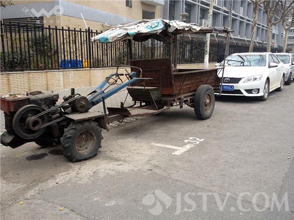 笔者今天上午,在现场看到,这辆锈迹斑斑的手扶拖拉机,前轮胎气已明显不足,拖拉机的换挡杆还上子锁,后拖箱上装满了报纸、果壳、饮料瓶、扫帚等杂物垃圾。住在附近的李先生说:“这辆拖拉机已经停在这里一年多,占着车位从来不挪窝,如果算一下停车费,估计可以买一辆新车,希望有关部门管一管,把它拖走,把车位腾出来,让给附近居民利用。”