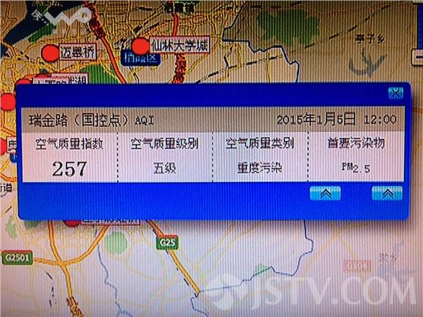 截止至今天中午12点,南京草场门、瑞金路、奥体中心等多个国控点的AQI值都高于每立方米200微克,达到重度污染,首要污染物为PM2.5。从全省来看,南京、常州、淮安、泰州、宿迁等城市为五级重度污染,徐州的AQI值甚至突破每立方米300微克,达到了严重污染级别。