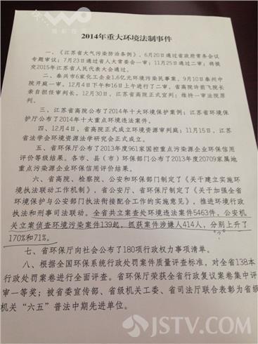 今天上午,江苏省环保厅邀请省法院、省检察院、高校法学专家、省环保厅有关处室有关人员,为公众解读新环保法,对泰州6排污企业判赔1.6亿元天价环境公益诉讼案进行剖析,发布2014年重大环境法制事件。其中,《江苏省大气污染防治条例》将提交2015年江苏省人民代表大会通过;泰州6排污企业判赔1.6亿元天价环境公益诉讼案;省环保厅公布2013年度961家国控重点污染源企业环保信用评价等级结果等入选2014年重大环境法制事件。