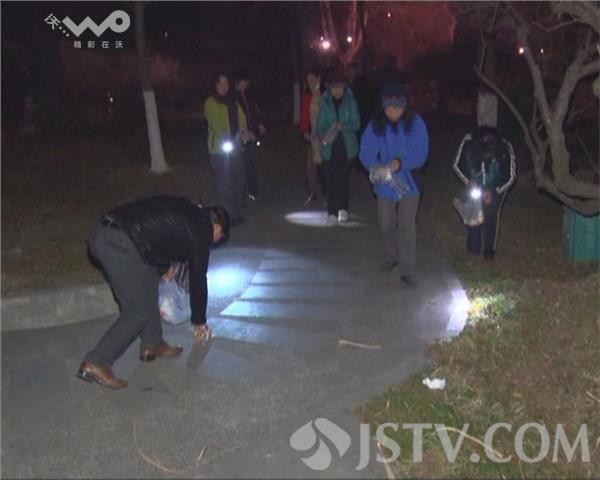昨天晚上笔者到玄武湖散步,发现在一条小路上有人打着手电筒在找什么东西,上前一看原来是一群人在沿途捡拾垃圾,这个得给个赞
