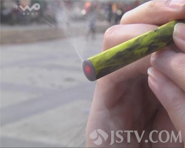 近日,在连云港解放路小学附近的地下通道里,经常能看到小学生买水果香味的电子烟玩。记者来到现场,也买了一支价格十元的电子烟,发现产品包装上没有任何生产厂家等相关信息,试着吹了一下电子烟,烟头会发出红光,并散发出类似香烟的雾气。而商贩表示,电子烟就是一个雾化器,什么都不含,就是含香精,有香味而已。