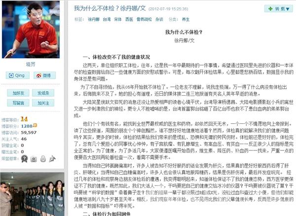 这篇文章作者署名徐丹娜,以中医自居。她写道:“西医为了让所有体检者都有病,会诱导每个人做定期体检,西医的宗旨就是变着法儿找“病”,变着法儿掏我们口袋里的钱。”字里行间,还常常以某知名中医的话为由头,抨击西医体检。这篇博文发出后,引起了众多网友关注。体检究竟有多大用呢?市民们也看法不一。南京市民刘先生说:“我们老百姓都是本来没有病,但是到医院之后全是病。”李女士说:“各有各的说法吧,我建议还是定期去体检比较好一点。”