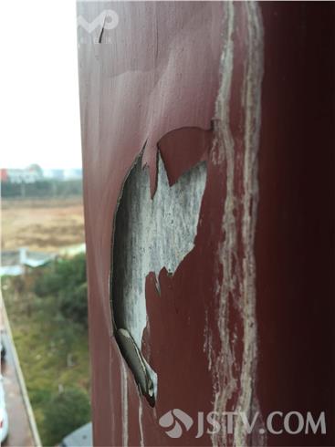 今天上午,记者跟随房屋质量检测专业人员来到现场,这位工作人员到达现场进行了仔细观察。随后向记者介绍说,第一,钢结构柱子表面上漆是有严格的工序,一般先对钢板表面进行处理,然后涂上专门的界面层涂料,再加上石膏,最后在上漆。第二,这每一道工序都有严格的时间控制,不经过严格的时间都会出现脱落的问题。