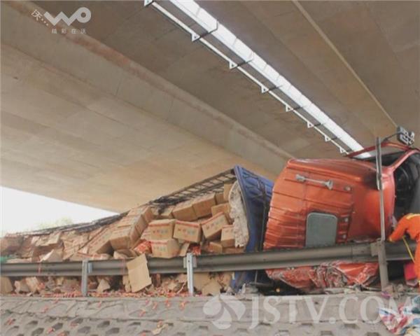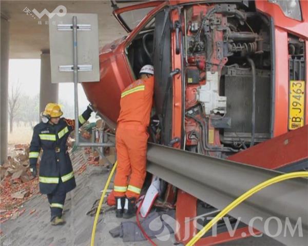 这辆半挂车侧翻在高速路出口附近,车上的烟花爆竹散落一地。半挂车油箱已损坏,柴油泄漏。为防止营救过程中,柴油着火引燃爆竹,消防人员先对车辆进行了喷水降温。由于事发地点正处在高速路出口,位置特殊,交警在远处拉起警戒线,提醒车辆绕行。消防发现货车副驾驶被卡在护栏与变形的车头处,立即采用液压顶杆扩张驾驶室,所有处置都是小心翼翼。