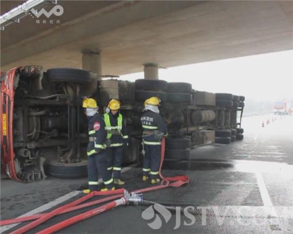 昨天下午1点50左右,徐州市连霍高速林东往济南方向,一辆装载40吨烟花爆竹的半挂车侧翻,车上有一人被困。因为周围都是烟花爆竹,消防人员在营救过程中,都捏了一把汗。