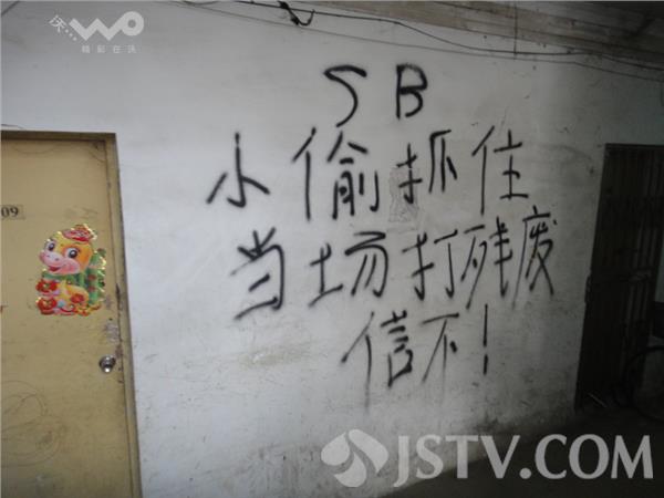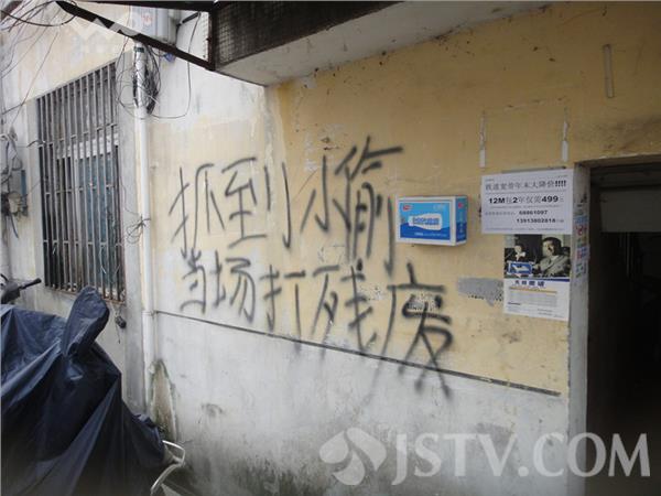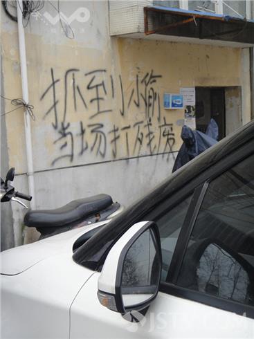 今天上午笔者路过大明路,看到附近一居民楼的单元门墙壁和楼道内墙壁上写着大大的“抓到小偷当场打残”和“小偷抓到当场打残废信不”的字样。据当地居民说,此处居民楼沿大马路,平时车辆和人员往来众多,住户家中经常被一些小偷光顾,小区居民无不狠之入骨。有居民表示下次抓到小偷后一定要将之打个半死再送派出所,以解心头之恨。于是有居民将此狠话当雅写在墙头,岂知自从这一涂雅上墙后,或许小偷真的害怕被打致残,便不再光顾此地了。或许这是一种震慑、或许这是一种巧合。