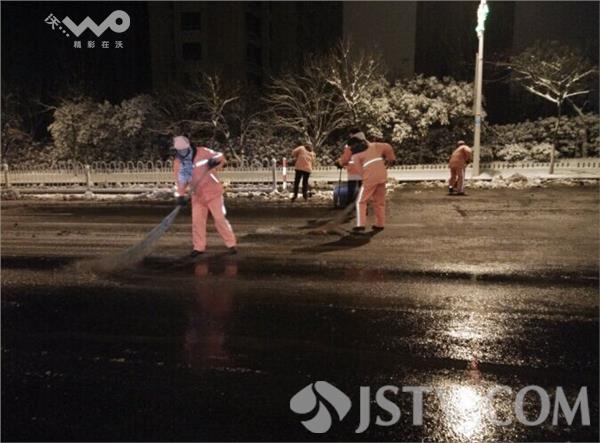 昨夜一场大雪突袭淮安市区,当人们还沉浸在香甜的睡梦中时,淮安全体环卫工人凌晨4点已经走上街头开始清除积雪,淮海路,健康路,北京路,延安路,解放路等主干道容易积雪处,一个个橘红色的身影紧张忙碌着。他们三五个人组成一个清扫组,对重要路段的积雪进行重点突击清扫。