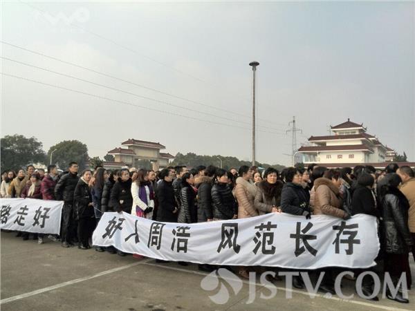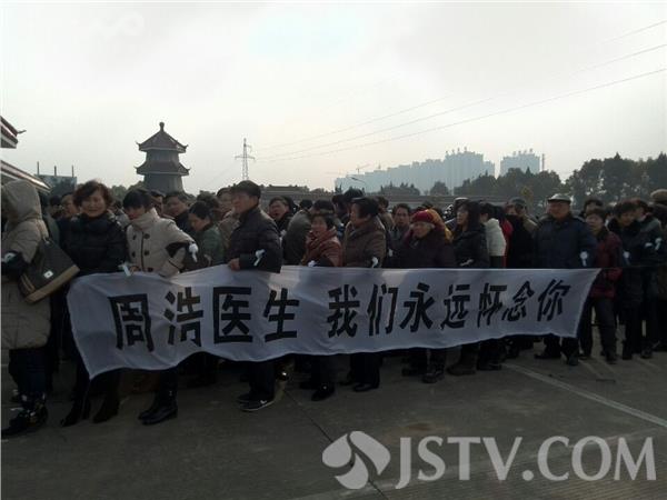 寒风中,人们打着“周浩医生,我们永远怀念你”、“浩哥,一路走好”的横幅,默默肃立。启东市民陈海娟的眼泪流个不停,自从5年前,婆婆因为脑动脉瘤破裂半身瘫痪住进启东市中医院,周浩就成了他们家的重要“成员”:每天早、中、晚数次来探视,和婆婆拉家常,教他们怎样护理,刺激病人的神经。她说,周浩不是像医生那样的交代,而是像朋友那样的叮嘱。上次婆婆出院有几个药没有拿到,前几天周浩打电话给她说药到了,叫她去拿,她感觉,周浩走了,他们家的“守护神”没了,他们不仅失去了一个朋友,更是失去了一位亲人。