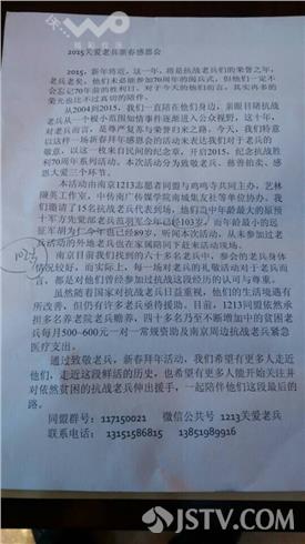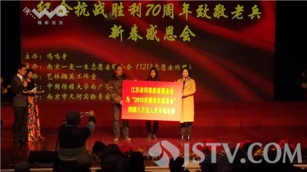 为纪念二战胜利及世界反法西斯战争胜利70周年,今天上午,由南京1213志愿者同盟与鸡鸣寺共同主办、艺林撷英工作室、中传南广传媒学院南城集友社等单位协办的“纪念抗战胜利70周年致敬老兵新春感恩会”在南京鸡鸣寺举行。15名抗战老兵代表出席了本次活动。活动仪式上,主办单位向老兵代表们献上抗战胜利70周年纪念章和鲜花,向他们致敬,并举行慈善拍卖活动,所得款项将全部用于赡养老兵。