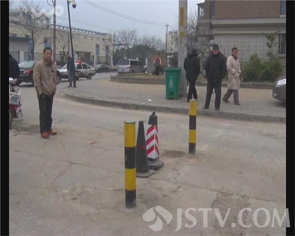 记者赶到现场后看到,马路中间果然插了几个扎眼的停车桩,其中一个已经被面包车撞坏。面包车车主王师傅说,这“坑人”的停车桩都是路边这个小区私下设置的,这里已经出了好几次事故。可小区物业却说,在路中间设置隔离桩是为了防止大货车和私家车进入小区,对此,小区业主并不认同,他们认为设置隔离桩的目的完全是小区物业为了自己收费方便。