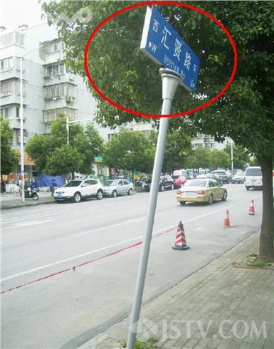 在城东宜春街,马路边路牌转向了45°,歪头的路牌和马路呈现出一个交叉的形状,在城北汇贤路,路牌立柱整个已倾向一边,疑似遭人推倒所致,最夸张的要算城西的江边南路了,路牌指示的南北向却刚好对准了东西向,整个路牌已反转90°,路牌所指方向已让人完全“不知所云”。值得一提的,江边南路反转的这一块路牌还正好处在鼓楼区滨江风光带的边上。