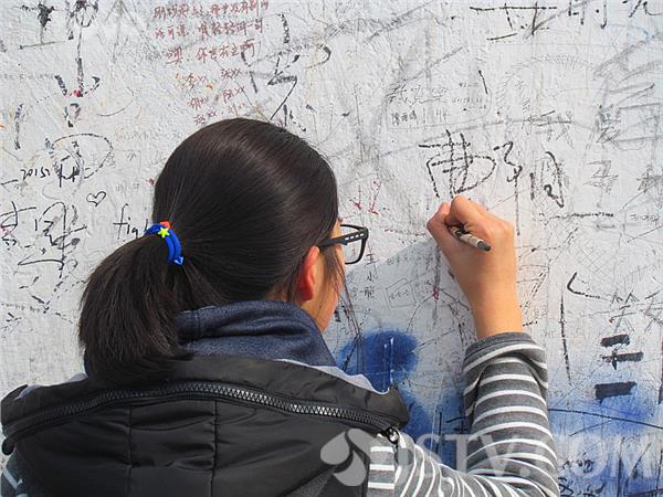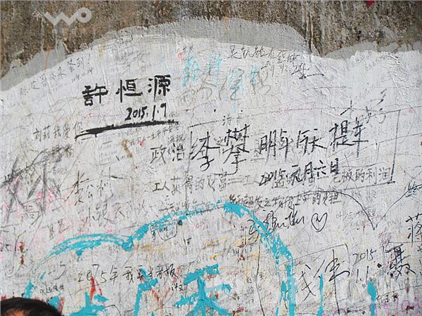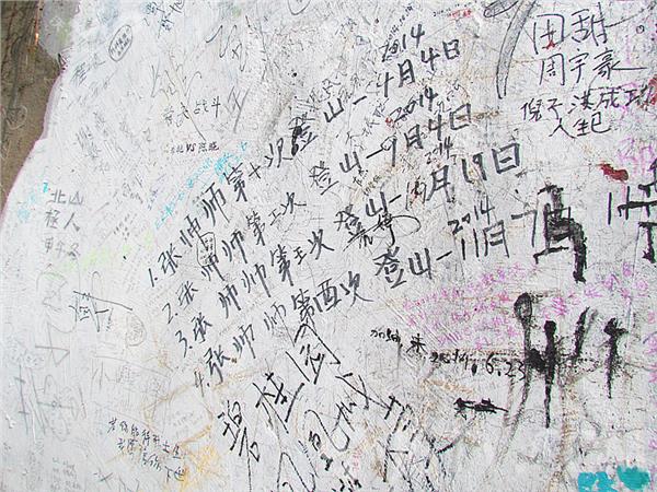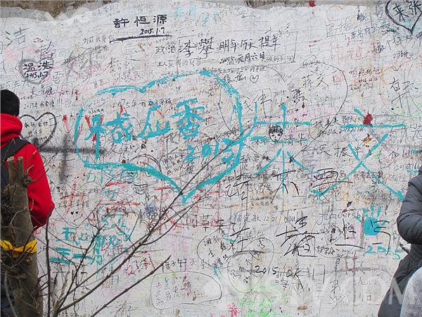 南京紫金山头陀岭顶峰的岩石上有很多游客的留言,在一处管理区的墙头上也有密密麻麻的留言,现场看到有游客用各种颜色的彩笔专心涂鸦,写的内容也是五花八门,有表示生日祝福的,有对父母祝福的,也有诉说自己愿望、表达爱意的。特别是一位叫“张师师”的游客先后多次登上紫金山顶峰,竟然在一处地方留下了不同时期登山的时间记录。亲眼见到,两位学生模样的一男一女现场“书法”,这里简直就像一个“天然留言板”,乱七八糟的“牛皮癣”十分刺眼。紫金山是南京市的绿肺,希望有关部门尽快清除这一丑恶现象。徐福庚7日摄