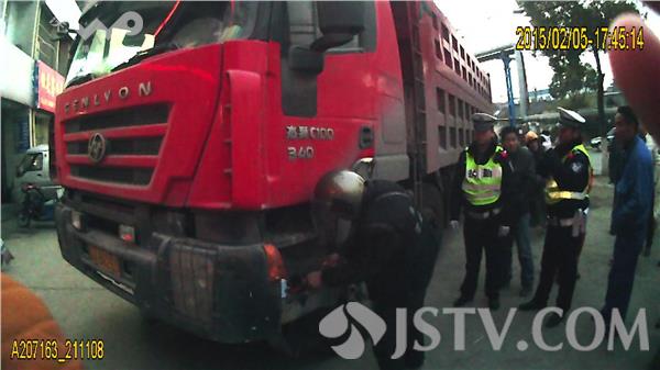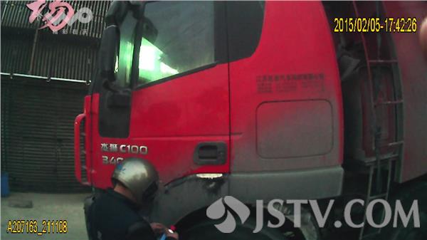 2月5日,民警刘建强在湛水路巡逻时,发现一辆车牌为苏AB8283的重型自卸货车有超载嫌疑,准备对车辆进行检查,谁知该车竟然绕起了“S”弯,企图躲避民警拦截,民警乘空隙驾车超越到货车前停下,驾驶员杨某承认货车超载,当听说超载要对车辆进行暂扣、过磅和驳载时,杨某扭头上车,并倒车准备逃离现场,完全不顾车后方仍在通行的非机动车安危,民警出于安全考虑没有上前紧逼,一边录像取证一边电台呼叫支援,在看到逃跑无望后杨某将车驶上人行道停靠至一饭店门前,以此对抗清障车的清拖,最后将车门上锁后快步逃跑。增援警力和清障车陆续到达,在准备对车辆进行清拖时,杨某迫于压力只得来到现场接受处理,经查该车涉嫌超载100%、非法加装高栏板、违停等多项交通违法行为,等待杨某的将是罚款2550元、扣6分,并自行拆除非法安装的高栏板。