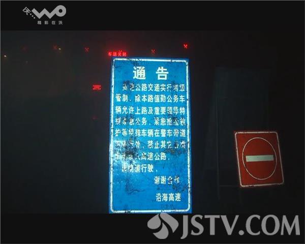 记者于11点钟赶到沈海高速射阳县陈洋出口时看到,路边的大显示屏上已经打出“前方大雾,道路封闭,敬请谅解”的提示,进高速的匝道处摆放了一块实行特级交通管制的通告牌,匝道上滞留了几辆大型货车在等待通行。据了解,射阳县陈洋出口是在晚上7点16分接到实行特级交通管制指令的。一名刚从高速公路上分流下来的驾驶员告诉记者,高速公路上面的能见度太低了,车子没办法开,只好下来找地方住一晚上,明天再走。刚从高速上下来的巡逻交警告诉记者,因为受到浓雾的影响,高速公路上的能见度极低,现在已经实行特级交通管制,所有车辆全部实行分流。