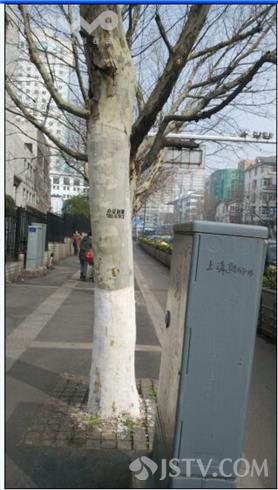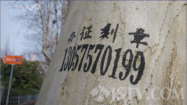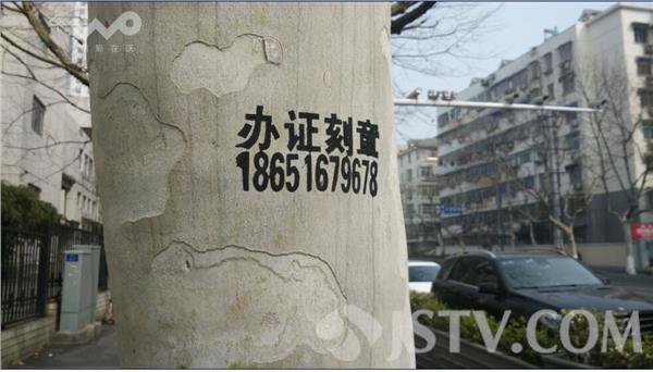 每到冬天,南京大街小巷的梧桐树会脱皮。树木脱皮后,外表光滑,纯洁。一些发布非法广告的人,看中了这些脱皮了树木,在上面发布广告了。记者今天上午在南京上海路看到,许多棵梧桐树上,都印上了做“证件”的电话号码等。
