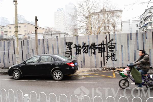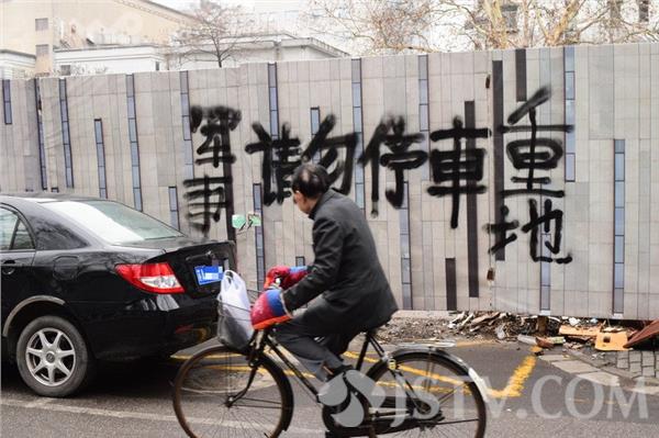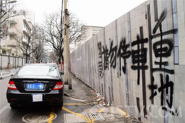 今日上午,笔者经过南京闹市区长江路附近时,发现路边一侧围墙上竟被人赫然涂写了“军事重地 请勿停车”字样的雷人标语,可是,具有讽刺意味的是,就在标语眼皮底下,却正好有一辆小车停靠在这里,并且“压”上了警示语下方的黄色禁停标线。