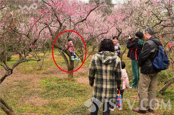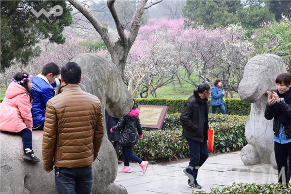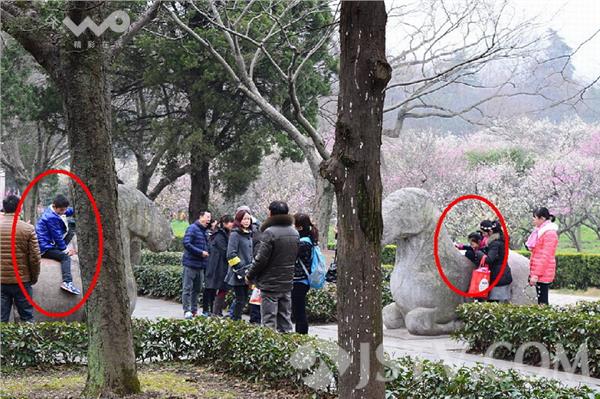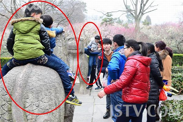 一年一度的南京国际梅花节自2月14日开幕以来,几乎每天吸引了大量中外游客前来观赏,各种梅花争奇斗艳,令人大饱眼福,可是,在游客欣赏梅花竞相盛开的同时,却同时也“欣赏”到了另一种不够和谐的景象:不少游客除了让自家孩子攀爬到梅花树上拍照,还“顺便”也攀爬到了旁边石像路上的石像上拍照留影,游客擅自攀爬梅树和文物的行为不免让人看后大跌眼镜。